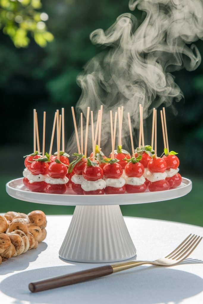 Caprese skewers with fresh mozzarella, cherry tomatoes, and basil drizzled with balsamic glaze make a delightful addition to a bridal shower, offering a refreshing bite that pairs perfectly with elegant tea sandwiches, creating a charming and sophisticated spread for the celebration.