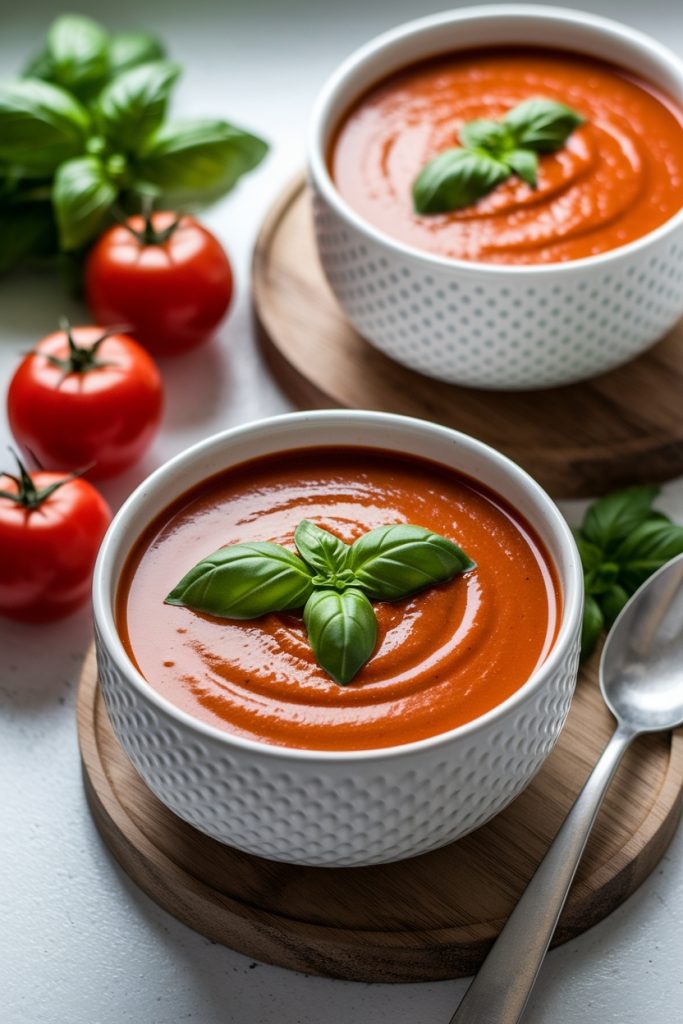 • Q: What is a delicious and comforting tomato soup recipe that features creamy textures and fresh basil flavors?