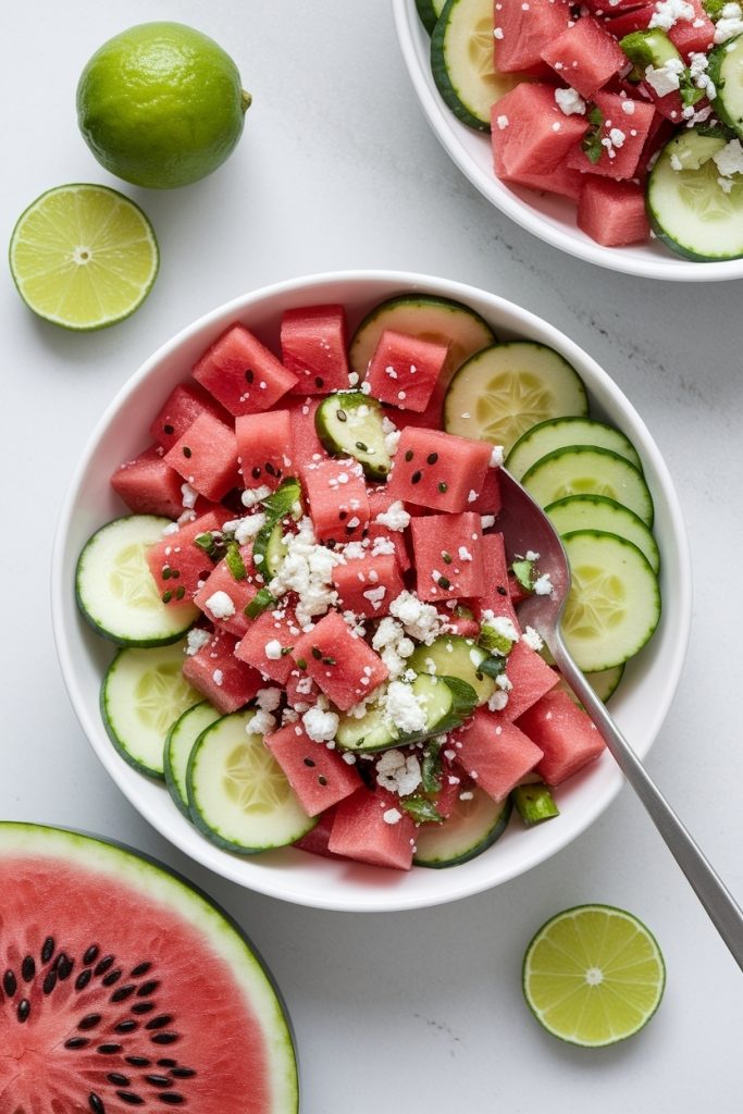 • Q: What are the key ingredients in a refreshing cucumber watermelon feta salad with a hint of lime?